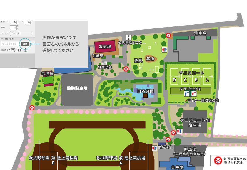 | ■使用上の注意 テニスコート・軟式野球場・陸上競技場を練習、試合、大会等で独占して使用する場合は、申し込みの上、使用料を納入し許可を受けてください。 |